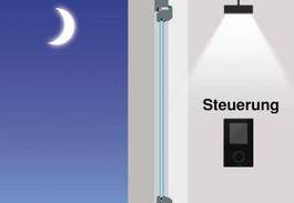 Sommer Tag An einem heißen Sommertag muss die Sonne weitgehend ausgesperrt werden, damit das Gebäude angenehm kühl bleibt. Der außenliegende Sonnenschutz reduziert den Lichteinfall und lässt ein blendfreies Arbeiten zu. Bei besonderen Anforderungen kann zusätzlich der innenliegende Blendschutz eingesetzt werden. | Sommer NachtNach einem heißen Sommertag ist das Gebäude aufgeheizt. In der Nacht fährt die Steuerung alle vorhandenen Sonnenschutzkomponenten hoch. So wird das Abkühlen des Gebäudes unterstützt und das Raumklima verbessert. |