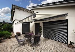 Die halbgeschlossene Gelenkarm-Markise Typ 750 bietet zusammen mit Ausfallprofil und Regenschutzdach einen optimalen Schutz vor Bewitterung von oben.